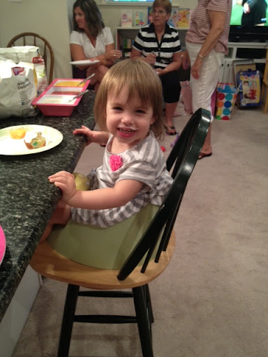 She is enjoying her birthday cake. She had a lot of family at her party. She got a lot of great toys. Her Nana and Dodo bought her a really great house!