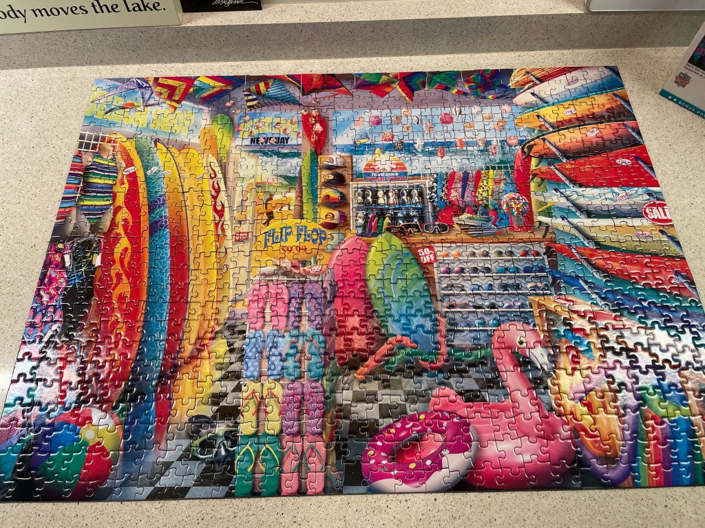 The Surf Puzzle finished. It is 750 pieces. It is a little below average puzzle – the pieces are a bit thick. The colors are great! I might try Mater Pieces puzzle again.