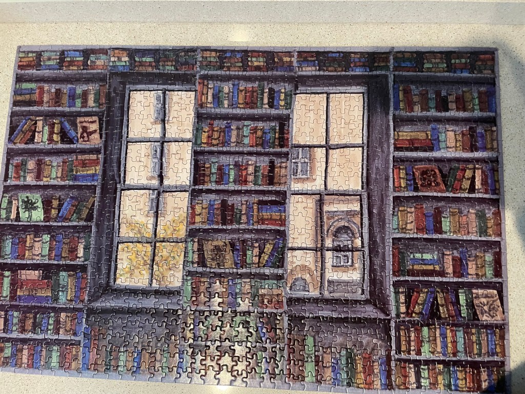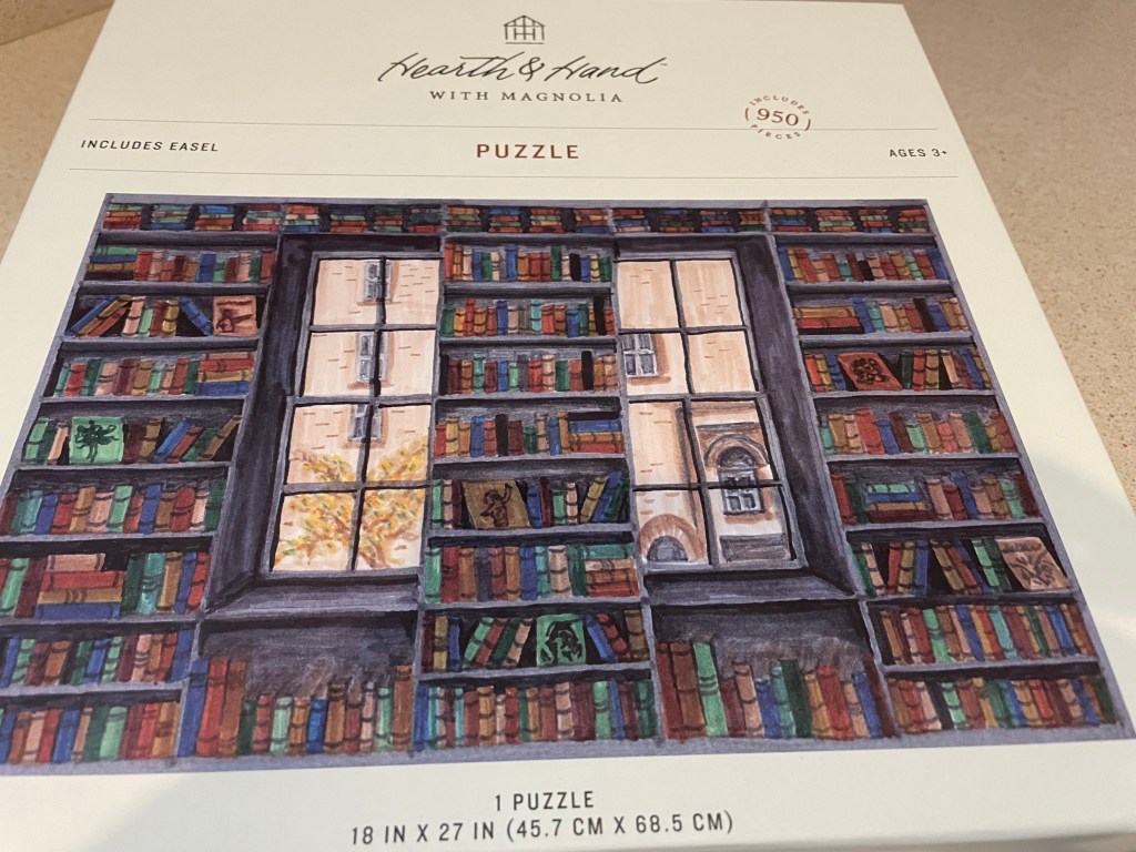 This puzzle was one of the hardest puzzles I have ever done. All the book colors are similar, so it was hard to see where the pieces belong. All the gray shelves were close to some of the book colors too. If you are in for a very hard challenge – buy it from Target.